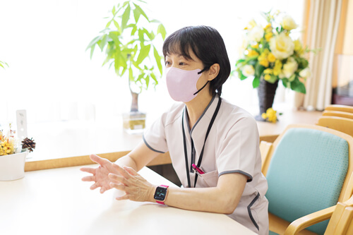 立てなくなった方がトイレに行きたいと訴えても、普通なら『無理だ』と諦めてしまうところを、何とかしてあげたいと思いました。全然立てない方を二人がかりでトイレに座らせたことがあります。その時、その方は病気後、初めてトイレで排尿ができ、本当に嬉しそうにされていて、一緒に喜び合える瞬間がすごく素敵でした。この仕事をしていなければ、こういう喜びを感じることはなかったと思います。